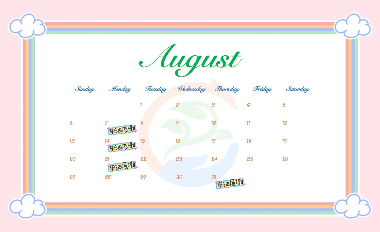 8/7(一),8/14(一),8/21(一),8/31(四)