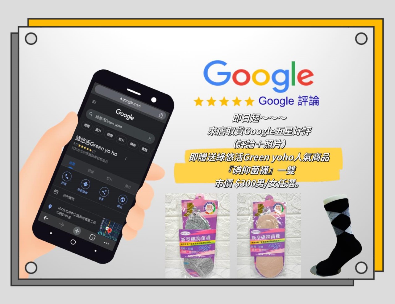 即日起~~~ 來店取貨Google五星好評(評論+照片) 即贈送綠悠活Green yoho人氣商品『碘抑菌襪』一雙,市價 $300,男/女任選。 #綠悠活企業有限公司 #健康安全希望 #台灣製造 #石墨烯美型纖纖褲 #碘抗菌襪 #曼達拉兆級優格 #共享健康能量活水機 #營業收入將捐出百分之十至財團法人礦工兒子教育基金會做為弱勢罹癌病童獎學金 #因為有你有綠悠活讓愛不只是期待