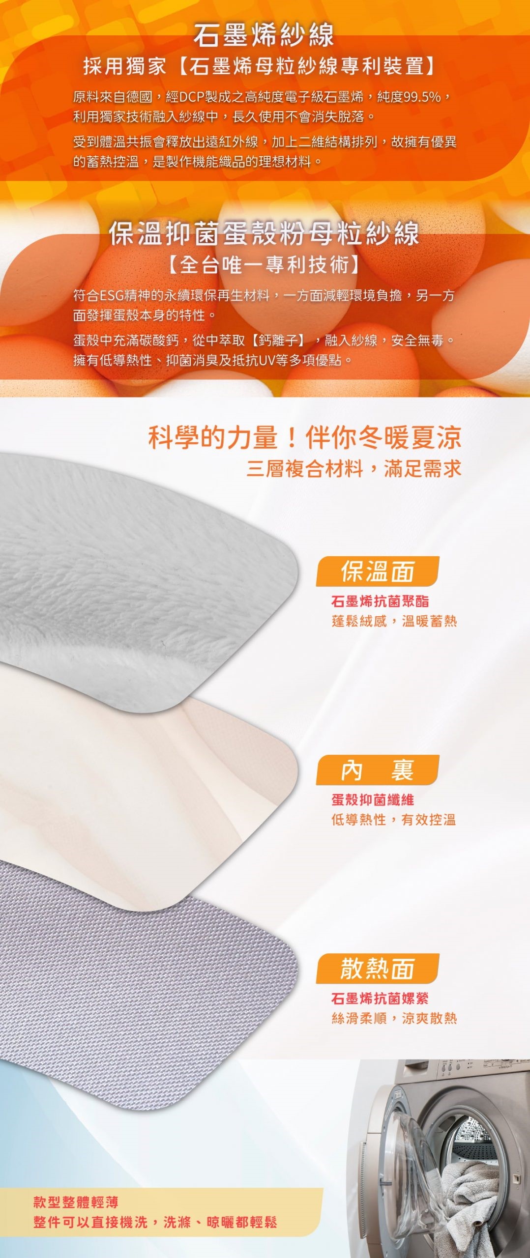 3.一件兩用,A面蓄熱保暖,B面清涼透氣,保溫棉層專利使用蛋殼抑菌纖維加倍防護。