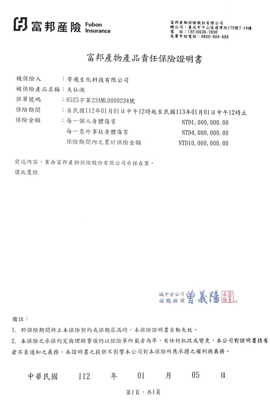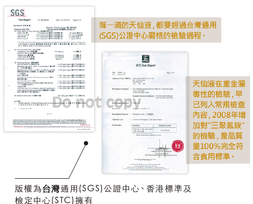 自1991年起,天仙液即接受美國、加拿大、澳洲、歐盟各國、日本、香港、台灣、東南亞各國家與地區,在各自不同的檢驗標準下,進行稽查與檢驗,而且,必須是100%完全合格後,才能進口至各國家與地區,也因為「無毒、純淨、安全」三項指標嚴格要求,才能夠取得天仙液通行全球的身份證。