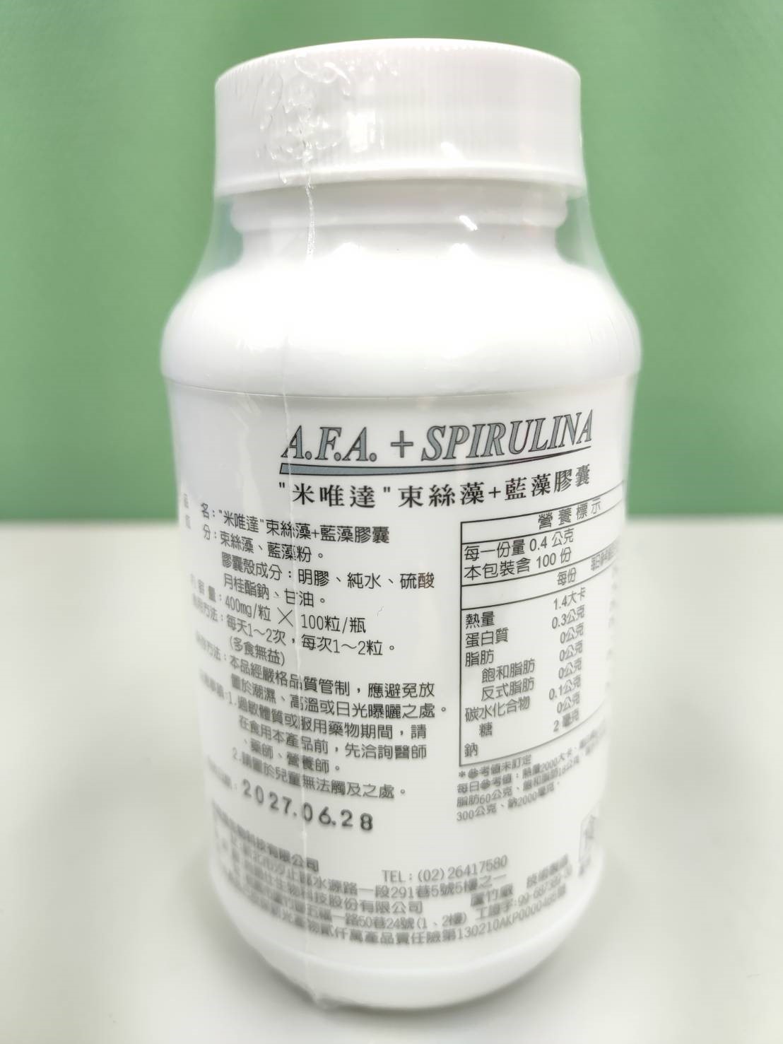 成分:束絲藻、藍藻粉。 膠囊成分:明膠、純水、硫酸月桂酯鈉、甘油。 容量:400mg/粒X100粒/瓶 食用方法:每天1~2次,每次1~2粒。(多食無益)